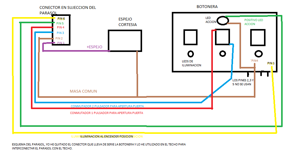 Como podeis ver, la botonera trae un conector de 6 pines, de los que usa 5, pero le quitamos ese conector macho y nos sirve para cambiar el de dos pines que trae el parasol en su conexion con el techo.