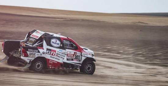 Ya no había razón para contener la euforia. Nasser Al-Attiyah y Mathieu Baumel se subían al capó de su Toyota Hilux V8 4×4 y ayudaban a Glyn Hall a elevarse también a lo alto de la montura antes de sujetar juntos...